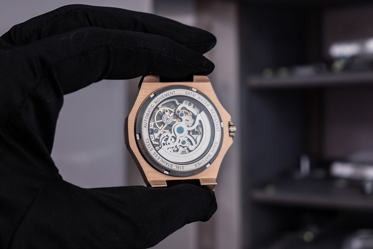 Elegant und angenehm zu tragen. Ein täglicher Begleiter und ein wunderschönes Schmuckstück. Der elegante Roséton ist eine tolle Anspielung auf das innere Schwarz. Die sichtbare Bewegung wird durch die natürlichen Bewegungen Ihres Handgelenks angetrieben.